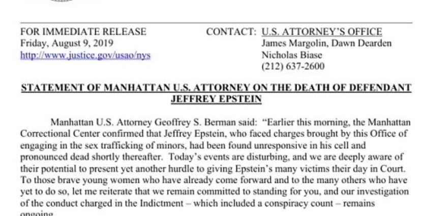 Newly released DOJ files show a federal statement on Jeffrey Epstein’s death was dated before he was officially found dead in his New York jail cell.